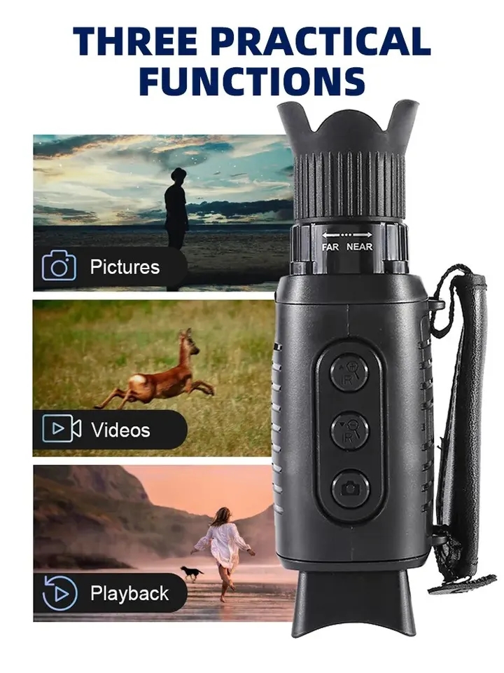 Incorpora LED infrarrojos de 850 nm, los 7 niveles de luces infrarrojas se pueden ajustar según la luz ambiental, lo que le brinda una mejor experiencia. Con un zoom de 5x, es la óptica perfecta para mejorar los sentidos visuales humanos. Con este producto, puedes observar entre 500 y 1000 m en total oscuridad. Con la función de foto, vídeo y reproducción, el orden de reproducción depende del modo de disparo.