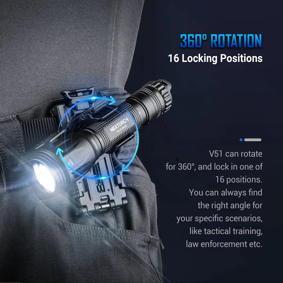 Adaptador de linterna con sistema giratorio 360º con clip para correa.